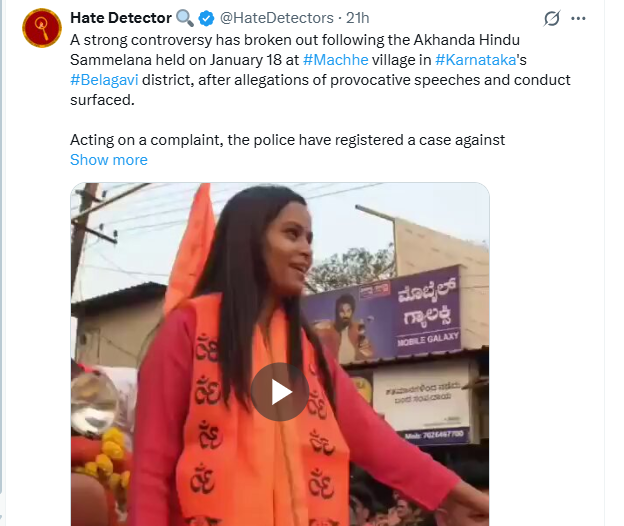 कर्नाटक के बेलगावी तालुक के माछे गांव के पास आयोजित अखंड हिंदू सम्मेलन से जुड़ी एक धार्मिक यात्रा के दौरान हुई भड़काऊ घटना के बाद बेलगावी ग्रामीण पुलिस ने महाराष्ट्र की हिंदुत्ववादी नेता हर्षिता ठाकुर सहित सात लोगों के खिलाफ आपराधिक मामला दर्ज किया है।