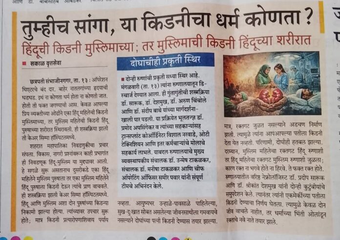 एक हिंदू महिला की किडनी एक मुस्लिम व्यक्ति के शरीर में और एक मुस्लिम महिला की किडनी एक हिंदू व्यक्ति के शरीर में ट्रांसप्लांट की गई। आप ही बताइए, यह किडनी किस धर्म की है? संभाजीनगर की यह घटना दिखाती है कि ऐसे खास पलों में ईश्वर नहीं, बल्कि इंसानियत और समझदारी ही लोगों को एक-दूसरे की मदद करने और ज़िंदगी बचाने के लिए आगे बढ़ाती है।