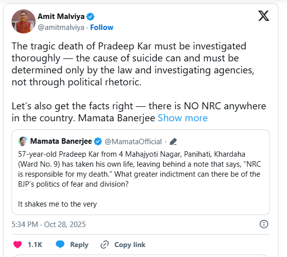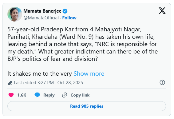 एक्स (पूर्व में ट्विटर) पर उन्होंने कहा, "4 महाज्योति नगर, पानीहाटी, खरदाहा (वार्ड नंबर 9) के 57 वर्षीय प्रदीप कर ने आत्महत्या कर ली है और अपने पीछे एक नोट छोड़ा है, जिसमें लिखा है, 'एनआरसी मेरी मौत के लिए ज़िम्मेदार है।' भाजपा की भय और विभाजन की राजनीति का इससे बड़ा अभियोग और क्या हो सकता है? यह सोचकर ही मैं अंदर तक हिल जाती हूँ कि कैसे वर्षों से भाजपा ने एनआरसी के डर से, झूठ फैलाकर, दहशत फैलाकर और वोटों के लिए असुरक्षा को हथियार बनाकर निर्दोष नागरिकों को सताया है। उन्होंने संवैधानिक लोकतंत्र को एक कठोर क़ानून-व्यवस्था में बदल दिया है, जहाँ लोगों को अपने अस्तित्व के अधिकार पर ही संदेह करने पर मजबूर किया जाता है। यह दुखद मौत भाजपा के ज़हरीले प्रचार का सीधा परिणाम है। दिल्ली में बैठकर राष्ट्रवाद का उपदेश देने वालों ने आम भारतीयों को इतनी निराशा में धकेल दिया है कि वे अपनी ही धरती पर मर रहे हैं, इस डर से कि उन्हें 'विदेशी' घोषित कर दिया जाएगा।"