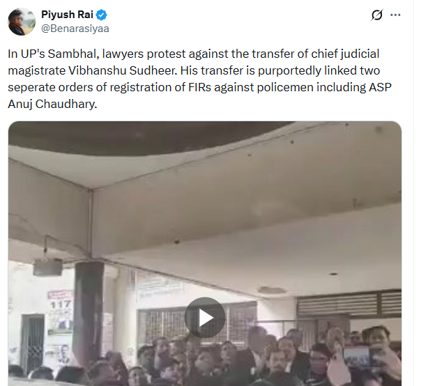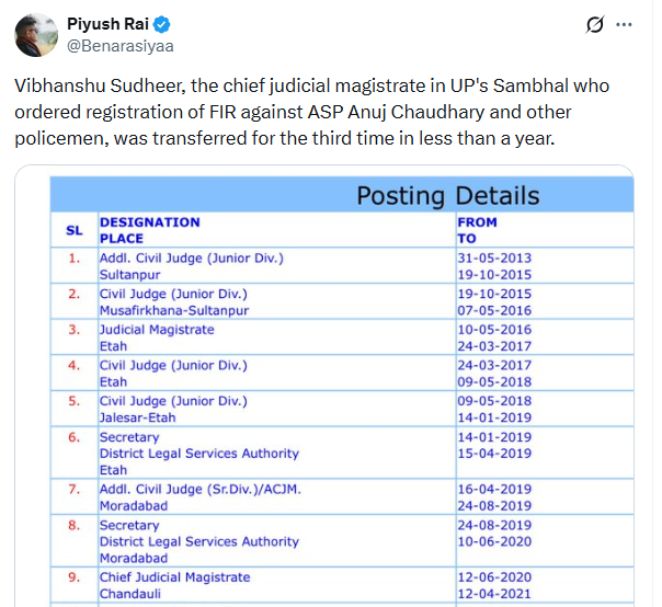 एक सोशल मीडिया यूजर ने पोस्ट किया कि यूपी के संभल में चीफ ज्यूडिशियल मजिस्ट्रेट विभांशु सुधीर, जिन्होंने ASP अनुज चौधरी और अन्य पुलिस अधिकारियों के खिलाफ FIR दर्ज करने का आदेश दिया था, का एक साल से भी कम समय में तीसरी बार ट्रांसफर कर दिया गया!