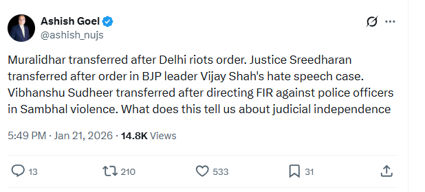 इस यूजर ने जागरूक जनता को यह भी याद दिलाया कि - एक सार्वजनिक रूप से बदले हुए फैसले में - सुप्रीम कोर्ट कॉलेजियम ने भी जस्टिस अतुल श्रीधरन का ट्रांसफर इलाहाबाद HC में किया, न कि छत्तीसगढ़ में जहां वे सबसे सीनियर जज होते! कॉलेजियम ने यह सार्वजनिक किया कि यह कार्रवाई केंद्र सरकार की 'सलाह' पर की गई थी। यह बात अक्टूबर 2025 में सार्वजनिक हुई। पिछले साल की शुरुआत में, जस्टिस श्रीधरन ने बीजेपी मंत्री विजय शाह के खिलाफ एक FIR का आदेश दिया था, क्योंकि उन्होंने भारतीय सेना की एक ऑफिसर, कर्नल सोफिया कुरैशी के खिलाफ "अपमानजनक भाषा" का इस्तेमाल किया था। कर्नल सोफिया कुरैशी उन भारतीय सेना के प्रतिनिधियों में से एक थीं जिन्होंने पिछले साल मई में ऑपरेशन सिंदूर के दौरान मीडिया को ब्रीफ किया था।