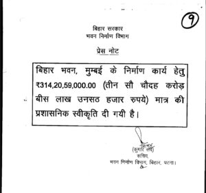 बिहार के करदाता! नीतीश कुमार के नेतृत्व वाली राज्य कैबिनेट ने इस परियोजना के लिए 314.20 करोड़ रुपये की प्रशासनिक मंज़ूरी दे दी है, जिससे निर्माण प्रक्रिया में तेज़ी आएगी। कुमार रवि ने कहा कि प्रस्तावित बिहार भवन सरकारी कामकाज, बैठकों और आवास की सुविधा प्रदान करेगा।