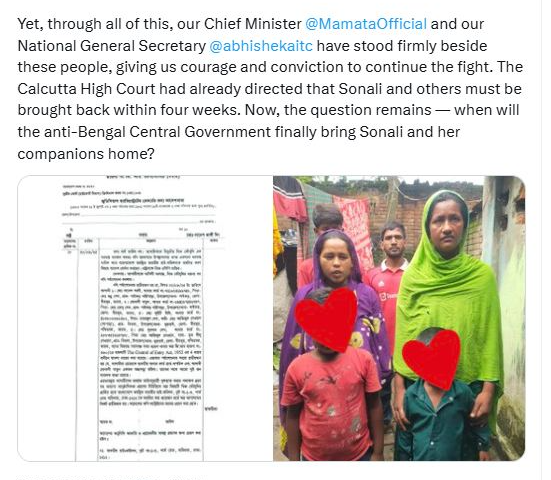 “जिन लोगों को हमारे अपने देश ने बांग्लादेशी करार देने की इतनी कोशिश की, कि वे अब भारतीय साबित हो गए हैं – हमारे द्वारा नहीं, बल्कि बांग्लादेश द्वारा। एक ऐतिहासिक फैसले में, एक बांग्लादेशी अदालत ने न केवल उन्हें भारतीय नागरिक घोषित किया है, बल्कि उनके आधार कार्ड नंबर और आवासीय पते को भी सबूत के तौर पर बताया है। अदालत का आदेश आधिकारिक तौर पर ढाका स्थित भारतीय उच्चायोग को भेज दिया गया है, जिसमें निर्देश दिया गया है कि उन सभी को – जिनमें बीरभूम की गर्भवती महिला सोनाली खातून भी शामिल हैं – सुरक्षित रूप से भारत वापस भेजा जाए।” इस्लाम ने इस फैसले की एक प्रति साझा करते हुए X पर लिखा।