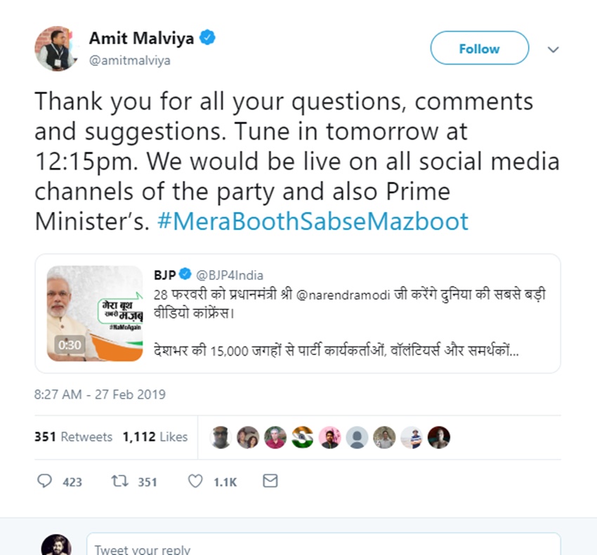 28 फरवरी को पीएम मोदी दुनिया की सबसे बड़ी वीडियो कॉफ्रेंस कर रहे हैं।इस दौरान वह 15000 जगहों से पार्टी से जुड़े लोगों को संबोधित करेंगे। इसी बात का प्रचार करते हुए बीजेपी के आईटी सेल प्रमुख अमित मालवीय ने ट्वीट करते हुए लिखा , आप सभी के सवालों और सुझावों के लिए धन्यवाद कल(गुरुवार) को 12:15 हम पार्टी और प्रधानमंत्री के सभी चैनलों से सोशल मीडिया के सभी चैनलों पर लाइव रहेंगे। सीमा पर चल रहे तल्ख माहौल के दौरान पार्टी के प्रचार को लेकर सोशल मीडिया पर लोगों ने अपना गुस्सा जाहिर किया।