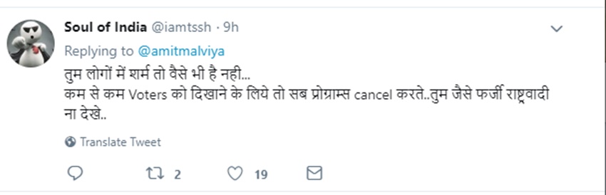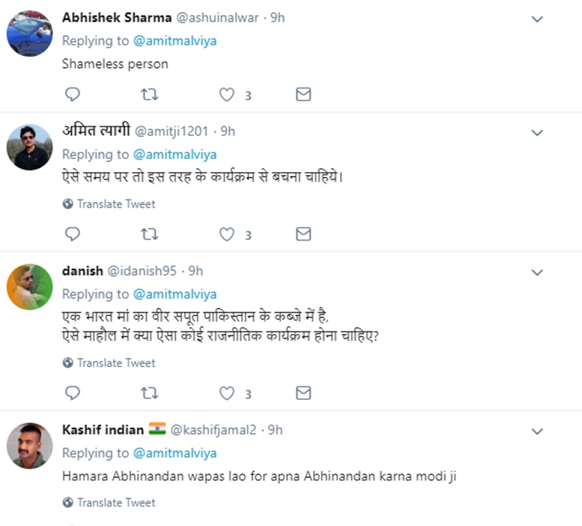 अमित मालवीय के इस ट्वीट पर लोग भड़क गए। हेमंत रजौरा ने लिखा है,बेशर्मी की हद होती है। हमारा बहादुर अभिनंदन पाकिस्तान के कब्जे में हैं और तुम्हें पार्टी के प्रचार की पड़ी है। हमें अभिनंदन वापस चाहिए और भाजपा को सबसे बड़ी पार्टी कॉन्फ्रेंस के बजाय अभिनंदन को वापस लाने का सबसे बड़ा सोशल मीडिया अभियान चलाना चाहिए।सोल ऑफ इंडिया नामक ट्विटर हैंडल से लिखा गया है। तुम लोगों में शर्म तो वैसे भी है नहीं…कम से कम वोटर्स को दिखाने के लिये तो सब प्रोग्राम्स करते करते..तुम जैसे फर्जी राष्ट्रवादी ना देखे..