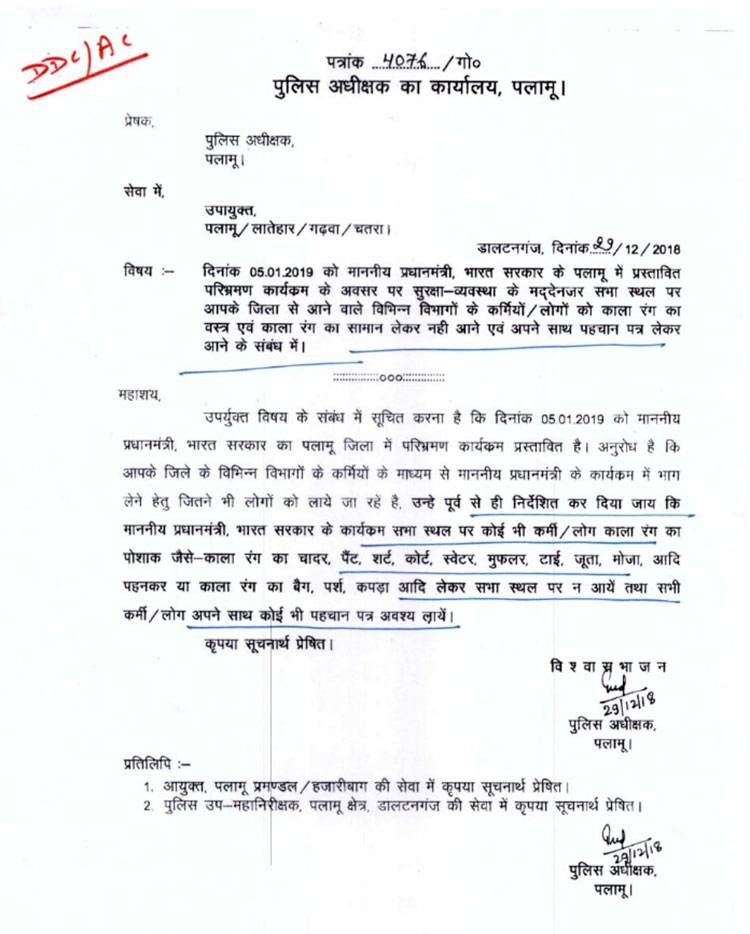 पलामू के पुलिस कप्तान इंद्रजीत महथा ने इस बाबत पलामू, लातेहार, गढ़वा और चतरा के डीसी को एक पत्र लिखा है। 29 दिसंबर, 2018 को लिखे गए इस पत्र में साफ-साफ कहा गया है कि कार्यक्रम में आने वाले किसी भी सरकारी कर्मचारी या सामान्य लोगों को किसी भी प्रकार का काला सामान या वस्त्र नहीं लाना है।