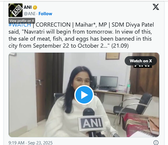 मध्य प्रदेश के मैहर और उमरिया जिलों में स्थानीय प्रशासन ने नवरात्रि के दौरान मांस, मछली और अंडों की बिक्री पर प्रतिबंध लगा दिया है। मैहर में उप-विभागीय मजिस्ट्रेट (एसडीएम) दिव्या पटेल ने बताया कि यह निर्णय इसलिए लिया गया क्योंकि इस शहर में मां शारदा का प्रसिद्ध मंदिर है, जहां त्योहार के दौरान लाखों श्रद्धालु आते हैं। उन्होंने कहा, "मैहर एक धार्मिक नगरी है और इसी समय नवरात्रि शुरू होती है, इसलिए प्रशासन 22 सितंबर से 2 अक्टूबर तक मांस, मछली और अंडों की बिक्री पर प्रतिबंध लगा रहा है।"