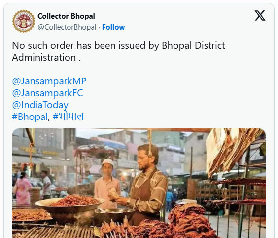 इस बीच, सोशल मीडिया पोस्ट और कुछ मीडिया संस्थानों ने दावा किया कि भोपाल में भी मांसाहारी भोजन पर इसी तरह का पूर्ण प्रतिबंध लगा दिया गया है। भोपाल कलेक्टर कौशलेंद्र विक्रम सिंह ने एक्स पर एक आधिकारिक बयान जारी कर इन दावों को खारिज कर दिया और स्पष्ट किया कि "भोपाल जिला प्रशासन द्वारा ऐसा कोई आदेश जारी नहीं किया गया है।"