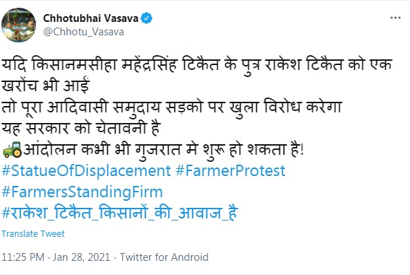 आदिवासी नेता वसावा का ट्वीट ऐसे समय में आया है, जब दिल्ली में 26 जनवरी को ट्रैक्टर रैली में उपद्रव के बाद किसान आंदोलन कमजोर पड़ता नजर आया। दिल्ली पुलिस ने एक दिन पहले ही राकेश टिकैत के खिलाफ उपद्रव के मामले में नोटिस थमाकर उनपर कानूनी शिकंजा कसना शुरू कर दिया था। वहीं, दूसरी तरफ यूपी के सीएम योगी आदित्यनाथ ने भी किसान आंदोलन खत्म कराने का आदेश दे दिया था।