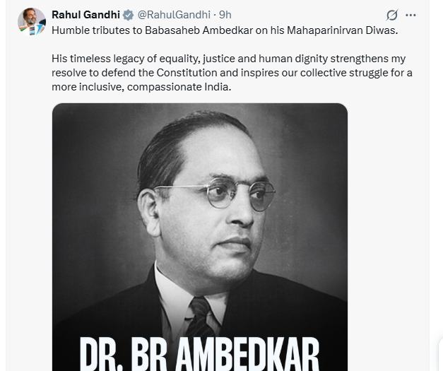 बाद में, सोशल मीडिया एक्स पर एक पोस्ट में, उन्होंने अपना संदेश दोहराया और कहा कि समानता, न्याय और मानवीय गरिमा की अंबेडकर की विरासत संवैधानिक मूल्यों की रक्षा करने के उनके संकल्प को मजबूत करती है। उन्होंने लिखा कि यह विरासत ज्यादा समावेशी और दयालु भारत के लिए देश के चल रहे संघर्ष को प्रेरित करती है।