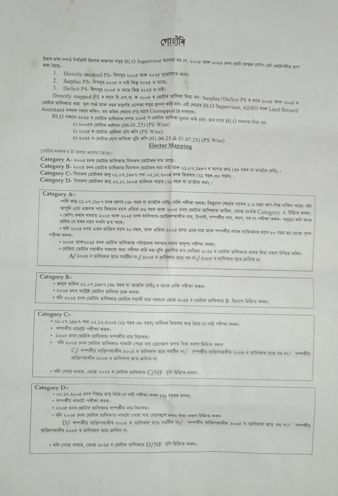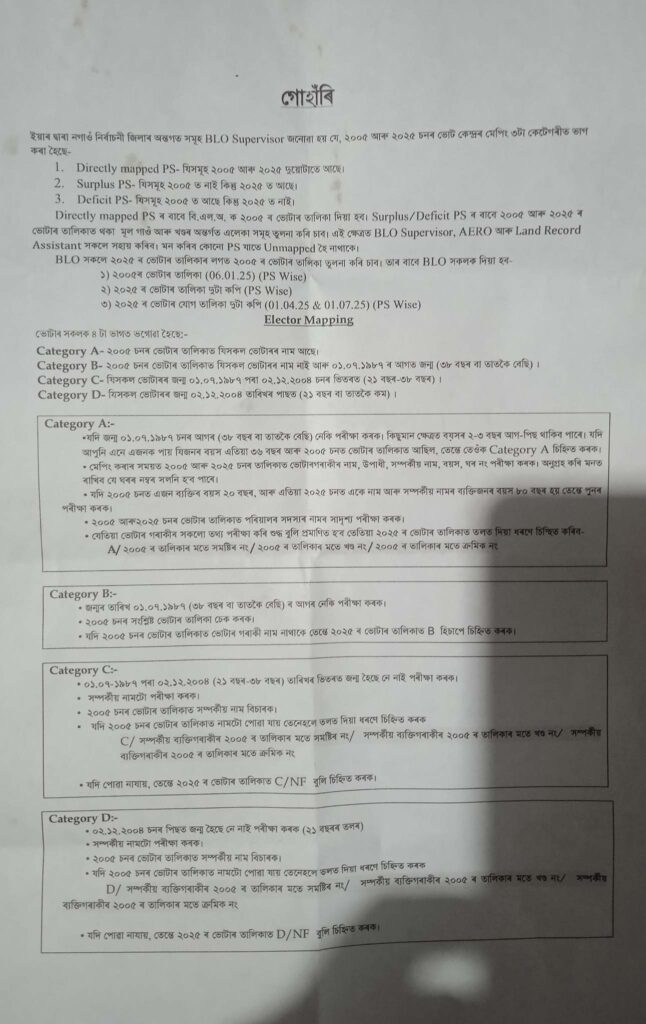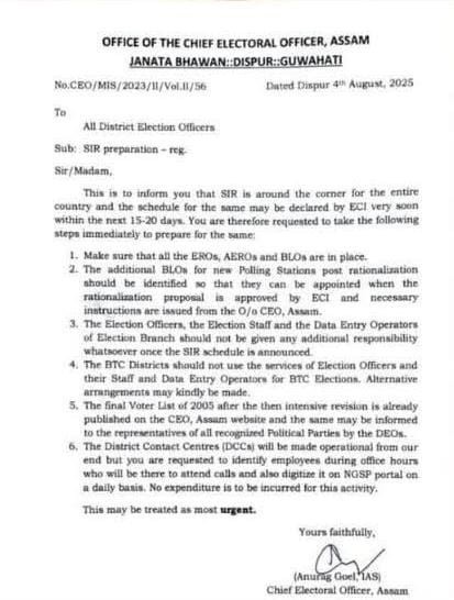 टाइम्स ऑफ इंडिया की रिपोर्ट के अनुसार, मुख्यमंत्री हिमंत बिस्वा सरमा ने सार्वजनिक रूप से घोषणा की कि एसआईआर मतदाता सूचियों को "साफ" करेगा। असम के मुख्य निर्वाचन अधिकारी (सीईओ) अनुराग गोयल ने जिला अधिकारियों को बीस दिनों के भीतर तैयारी पूरी करने का निर्देश दिया है-यह रफ्तार बिहार में चल रही अधिक-दबाव वाली प्रक्रिया के जैसा है। यहां संदर्भ बिंदु 2005 का संशोधन है, जिसे अब तुलना के लिए राजनीतिक दलों के साथ साझा किया जा रहा है।