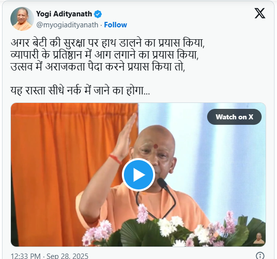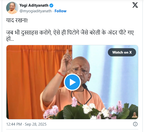 मुख्यमंत्री की प्रतिक्रिया (28 सितंबर, 2025): ‘विकसित यूपी’ कार्यक्रम में मुख्यमंत्री योगी आदित्यनाथ ने कहा कि जो लोग “धर्म के नाम पर तोड़फोड़ करते हैं… पुलिस पर हमला करते हैं… उन्हें हम नहीं छोड़ेंगे… छेड़ोगे तो छोड़ेंगे नहीं और छोड़ेंगे नहीं तो फिर छूटोगे भी नहीं।” उन्होंने कहा कि “डेंटिंग और पेंटिंग तो करनी ही पड़ेगी” और इस प्रतिक्रिया को त्योहारों और सार्वजनिक सुरक्षा की रक्षा के लिए जरूरी बताया। ये बयान नेशनल न्यूज आउटलेट में उसी दिन और अगले दिन और उसके बाद भी व्यापक रूप से प्रकाशित किए गए।