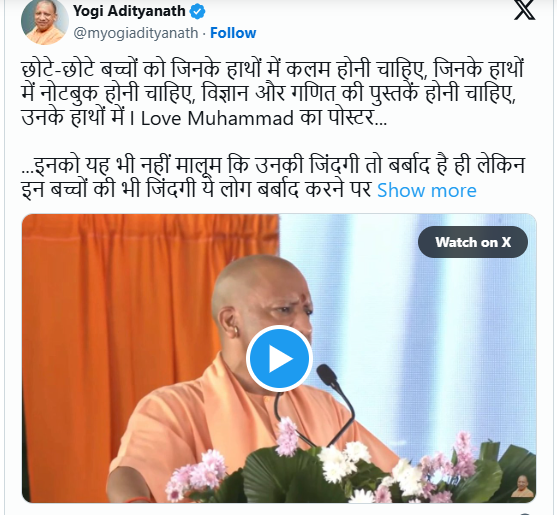 सितंबर 2025 में शुरू हुए “आई लव मुहम्मद” विवाद के बाद उत्तर प्रदेश के मुख्यमंत्री योगी आदित्यनाथ ने बार-बार सार्वजनिक बयान दिए। विशेष रूप से 28 सितंबर को अपने बयान में सार्वजनिक व्यवस्था को “परेशान” करने वालों के लिए सख्त, स्पष्ट सजा का वादा करते हुए कहा कि, “छेड़ोगे तो छोड़ेंगे नहीं”, “पीढ़ियां याद रखेंगी”, “गजवा-ए-हिंद सफल नहीं होगा और इसके बजाय उसे नरक का टिकट दिया जाएगा” और “डेंटिंग और पेंटिंग की जानी चाहिए” जैसी बातें की।
