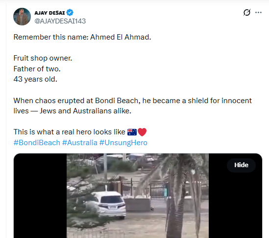 43 साल के एक मुस्लिम अहमद अल अहमद दो बच्चों के पिता, जिन्होंने बहादुरी से अपनी जान जोखिम में डालकर हनुक्का मना रहे अपने पड़ोसियों को बचाया, उन्होंने असाधारण साहस दिखाया।