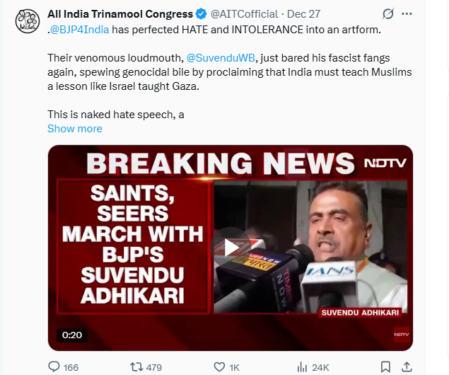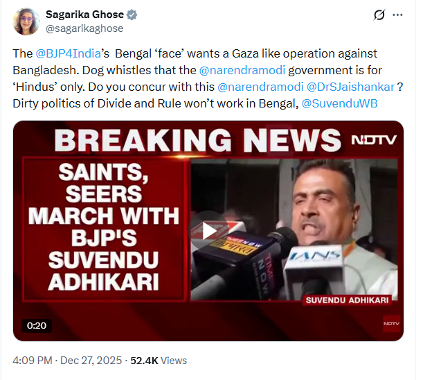 तृणमूल कांग्रेस की सांसद और राज्यसभा में पार्टी की नेता सागरिका घोष ने X पर पोस्ट किया, “बीजेपी का बंगाल का ‘चेहरा’ बांग्लादेश के खिलाफ गाज़ा जैसा ऑपरेशन चाहता है। यह संकेत देता है कि नरेंद्र मोदी सरकार सिर्फ ‘हिंदुओं’ के लिए है। बांटो और राज करो की गंदी राजनीति बंगाल में काम नहीं करेगी।”