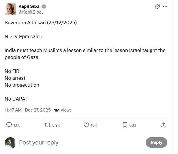कांग्रेस नेता कपिल सिब्बल ने यह भी कहा कि अधिकारी की टिप्पणियों के बावजूद “कोई FIR नहीं, कोई गिरफ्तारी नहीं, कोई मुकदमा नहीं, कोई UAPA नहीं लगा।”