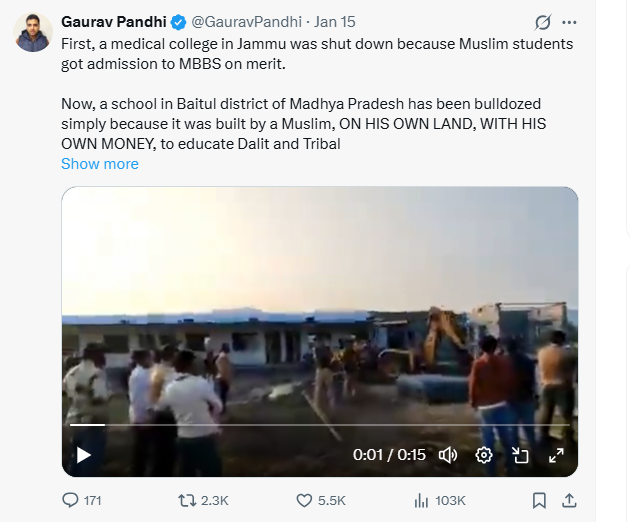 जम्मू में एक मेडिकल कॉलेज को इसलिए बंद कर दिया गया क्योंकि मुस्लिम छात्रों को मेरिट के आधार पर MBBS में प्रवेश मिला था। नफरत और बदनामी के ऐसे ही माहौल में, और अब खुले नफरत भरे प्रचार के बीच, मध्य प्रदेश के बैतूल जिले में एक स्कूल को कथित तौर पर सिर्फ इसलिए गिरा दिया गया क्योंकि उसे एक मुस्लिम ने बनवाया था।
