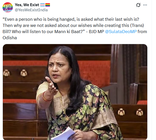 हिंदुस्तान टाइम्स की रिपोर्ट के अनुसार, सत्ताधारी दल के कई सांसदों ने संसदीय बहसों के दौरान इसी तर्क को दोहराया और इस संभावना पर चिंता जताई कि कुछ व्यक्ति लाभ पाने के लिए झूठी ट्रांसजेंडर पहचान का दावा कर सकते हैं। सरकार ने ट्रांसजेंडर व्यक्तियों के कल्याण के प्रति अपनी प्रतिबद्धता के प्रमाण के तौर पर अपनी व्यापक पहलों- जैसे जागरूकता कार्यक्रम, रोजगार मेले और हेल्पलाइन- का भी जिक्र किया है।