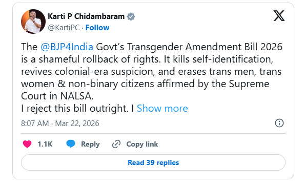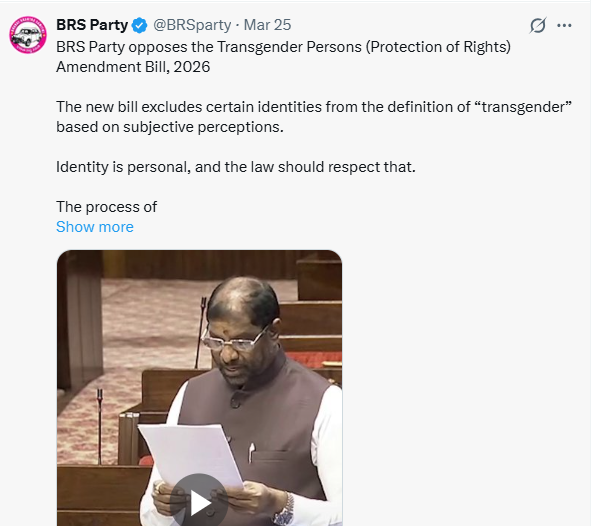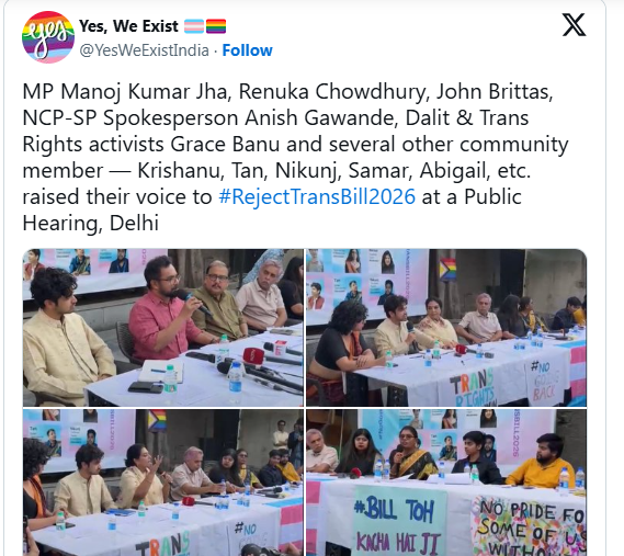ट्रांसजेंडर व्यक्ति (अधिकारों का संरक्षण) संशोधन विधेयक, 2026 पर संसदीय बहस में विपक्षी दलों की ओर से एक असामान्य रूप से एकजुट और जबर्दस्त प्रतिक्रिया देखने को मिली, उन्होंने अपनी आपत्तियों को केवल राजनीतिक नजरिए से ही नहीं, बल्कि एक संवैधानिक सिद्धांत के मामले के तौर पर पेश किया। द हिंदू के अनुसार, कांग्रेस, DMK, AITC, SP, RJD, AAP, CPI(M), BJD और अन्य दलों सहित सभी पार्टियों के सांसदों ने लगातार यह तर्क दिया कि यह विधेयक पिछले एक दशक में स्थापित अधिकार-आधारित ढांचे से एक मौलिक भटकाव है और इसमें समानता, गरिमा और व्यक्तिगत स्वतंत्रता की मूल गारंटियों का उल्लंघन होने का जोखिम है।