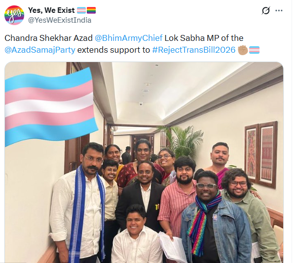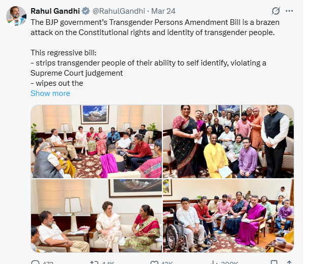 संसद के बाहर, राजनीतिक नेताओं ने सार्वजनिक बयानों में इन चिंताओं को और मजबूती से उठाया। कांग्रेस सांसद और विपक्ष के नेता राहुल गांधी ने इस बिल को ट्रांसजेंडर व्यक्तियों के संवैधानिक अधिकारों और पहचान पर एक "बेशर्मी भरा हमला" बताया, उन्होंने तर्क दिया कि यह बिल व्यक्तियों से अपनी पहचान खुद तय करने की क्षमता छीन लेता है और उन्हें अमानवीय जांच-पड़ताल के अधीन कर देता है। इस तरह के हस्तक्षेप यह संकेत देते हैं कि इस बिल की संवैधानिक आलोचना केवल विधायी बहस तक ही सीमित नहीं है, बल्कि यह अधिकारों और शासन व्यवस्था पर चल रही एक व्यापक राजनीतिक चर्चा का भी हिस्सा है।