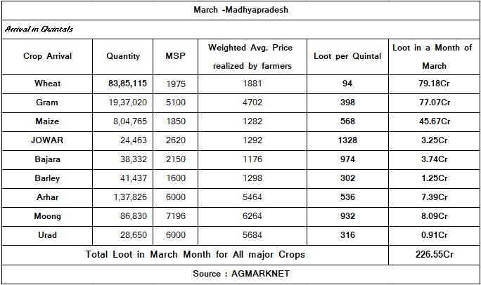 किसानों द्वारा जारी किए गए न्यूनतम समर्थन मूल्य (MSP) लूट कैलक्यूलेटर ने मार्च, 2021 के दौरान मध्य प्रदेश (एमपी) के किसानों की बिगड़ती स्थिति को उजागर किया है। जय किसान आंदोलन द्वारा जारी किये गए आंकड़ों के अनुसार, राज्य के किसानों को एमएसपी से नीचे विभिन्न फसलों की बिक्री के कारण लगभग 226.55 करोड़ रु. का नुकसान हुआ है।