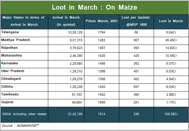 मक्का की फसल के लिए एमएसपी 1850 रुपये प्रति क्विंटल है। इसके बावजूद देशभर में सभी मंडियों ने किसानों से औसतन 1,514 रुपये प्रति क्विंटल खरीदारी की है। इस प्रकार, किसानों को एमएसपी से कम कीमत पर बेचने के कारण 336 रुपये प्रति क्विंटल का नुकसान हुआ। कुल मिलाकर किसानों को लाखों रुपये का नुकसान हुआ। अकेले मक्का की फसल के लिए मार्च में 105.58 करोड़ रुपये का नुकसान किसानों को उठाना पड़ा।