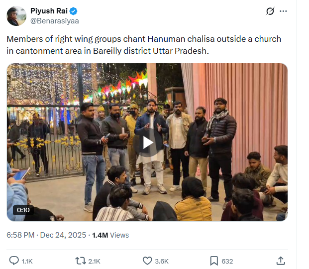 बरेली और UP के दूसरे हिस्सों में, समूहों ने चर्चों के बाहर इकट्ठा होकर हनुमान चालीसा और "ईसाई मिशनरी मुर्दाबाद" जैसे नारे लगाए। ये जवाबी जश्न नहीं थे, बल्कि धार्मिक रूप से डराने-धमकाने के जानबूझकर किए गए काम थे, जिन्हें ठीक क्रिसमस के पहले की प्रार्थना सभाओं के समय किया गया था (इंडिपेंडेंट UK; वीडियो X पर बड़ी संख्या में सर्कुलेट हुए)।