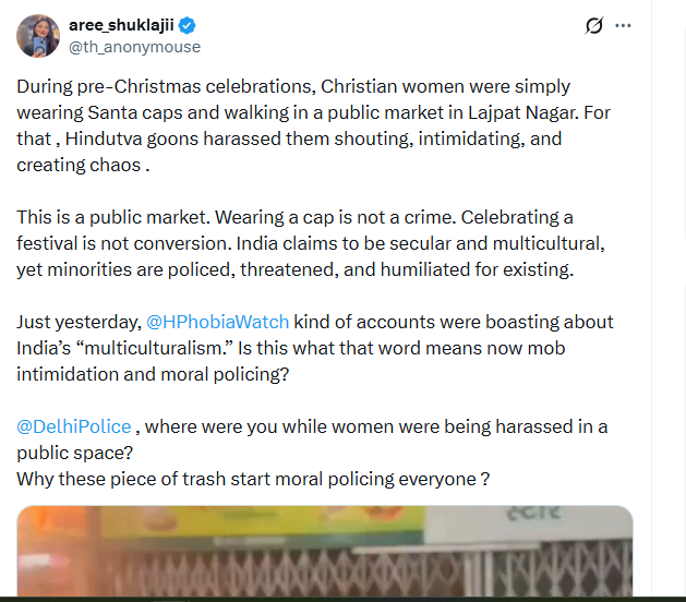 लाजपत नगर में सांता कैप पहनी हुई ईसाई महिलाओं को सिर्फ एक पब्लिक मार्केट से गुज़रने पर परेशान किया गया, उन पर चिल्लाया गया और उन पर धर्म परिवर्तन का आरोप लगाया गया। त्योहारों वाली टोपी पहनने को आपराधिक इरादा बताया गया। महिलाएं धर्म का प्रचार नहीं कर रही थीं बल्कि वे पब्लिक जगह पर ईसाई होने के नाते मौजूद थीं - और इसके लिए उन्हें सजा दी गई (द क्विंट; X वीडियो)।
