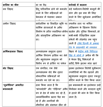 ● महाराष्ट्र में, “सकल हिन्दू समाज” और “हिन्दू जनजागृति मंच” जैसी समूह हिंदू जनअक्रोश रैलियां आयोजित करते हैं, जिनमें ‘जिहाद’ साजिशों के सबसे चरम विचार फैलाए जाते हैं और हथियार उठाने की अपील तक की जाती है। बिहार में, “आई लव मुहम्मद” कैंपेन की वजह से अफरा-तफरी और हिंसा हुई।