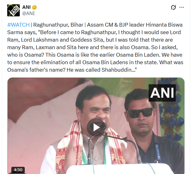 असम के CM और BJP नेता हिमंत बिस्वा सरमा ने कहा, “रघुनाथपुर आने से पहले, मैंने सोचा था कि मैं भगवान राम, भगवान लक्ष्मण और देवी सीता के दर्शन करूंगा, लेकिन मुझे बताया गया कि यहां कई राम, लक्ष्मण और सीता हैं और ओसामा भी है। तो मैंने पूछा, ओसामा कौन है? यह ओसामा पहले वाले ओसामा बिन लादेन जैसा है। हमें राज्य में सभी ओसामा बिन लादेन का खात्मा पक्का करना है। ओसामा के पिता का क्या नाम था? उन्हें शाहबुद्दीन कहा जाता था…”