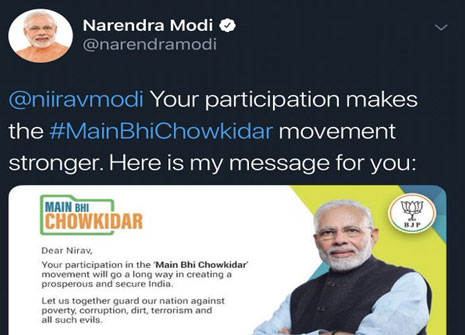 बीजेपी ने हाल ही में आगामी लोकसभा चुनाव के लिए ‘मैं भी चौकीदार कैंपेन’ शुरू किया है। इसको लेकर ट्विटर पर बाकायदा अभियान छेड़ा गया। लेकिन बीजेपी और प्रधानमंत्री उस समय ट्रोल हो गए जब पीएम के आधिकारिक ट्विटर हैंडल से पीएनबी घोटाले के आरोपी नीरव मोदी के पैरोडी एकाउंट समेत कई लोगों को टैग करते हुए ट्वीट किया गया।