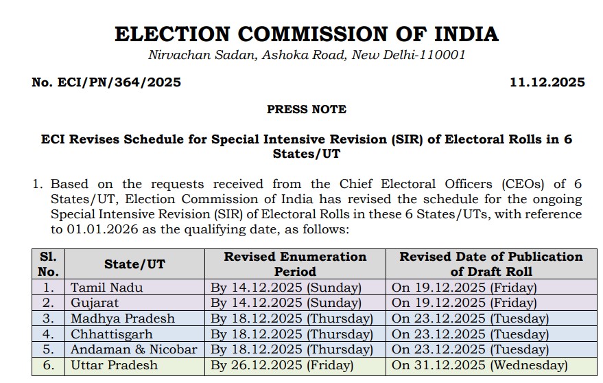 11 दिसंबर को चुनाव आयोग ने 6 राज्यों में गिनती और ड्राफ्ट पब्लिकेशन की टाइमलाइन को संशोधित किया। तमिलनाडु और गुजरात में गिनती 14 दिसंबर, 2025 तक बढ़ा दी गई, जिसके बाद 19 दिसंबर को ड्राफ्ट वोटर लिस्ट प्रकाशित की गई। मध्य प्रदेश, छत्तीसगढ़ और अंडमान व निकोबार द्वीप समूह को ज्यादा समय दिया गया, जिससे गिनती 18 दिसंबर तक जारी रही, जिसके बाद 23 दिसंबर, 2025 को ड्राफ्ट लिस्ट जारी की गई। केरल का संशोधन भी इसी तरह हुआ, जिसमें विस्तारित फील्ड वेरिफिकेशन के बाद 23 दिसंबर को ड्राफ्ट लिस्ट प्रकाशित हुई।