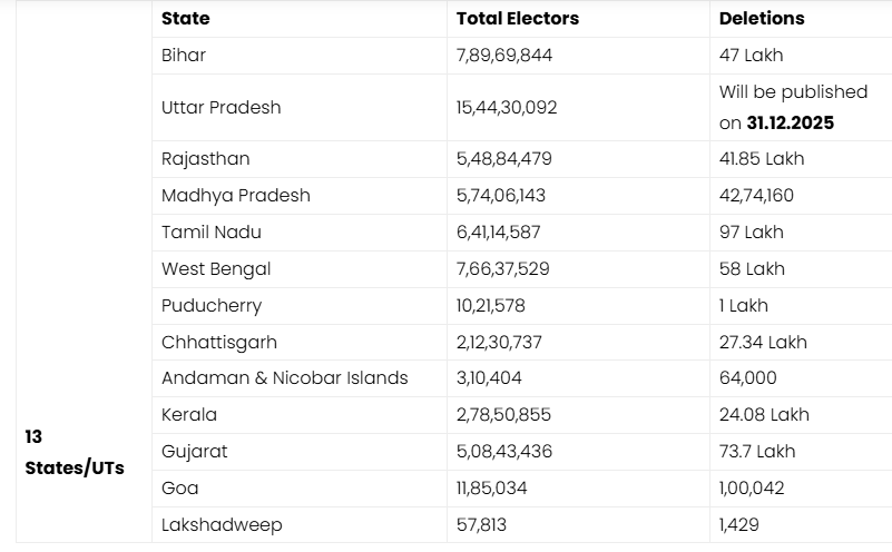 SIR के तहत ड्राफ्ट रोल पब्लिश होने के बाद 12 राज्यों और केंद्र शासित प्रदेशों में 3.5 करोड़ से ज्यादा वोटर्स को वोटर लिस्ट से अस्थायी रूप से हटा दिया गया है। उत्तर प्रदेश, जहां देश में सबसे ज्यादा वोटर हैं, 31 दिसंबर, 2025 को अपनी ड्राफ्ट वोटर लिस्ट पब्लिश करने वाला है, जो जारी विवादित रिवीजन प्रोसेस का अगला बड़ा चरण होगा।