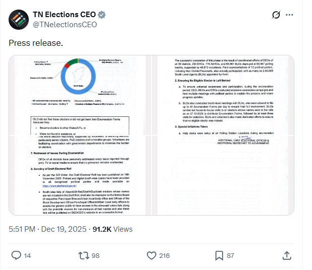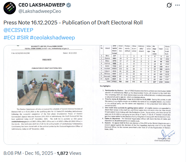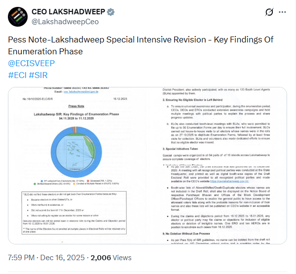 इस रिलीज से ड्राफ्ट लिस्ट पब्लिश करने वाले राज्यों और केंद्र शासित प्रदेशों की संख्या बढ़कर 12 हो गई और कुल मिलाकर SIR के कारण देश भर में वोटर लिस्ट से 3.5 करोड़ से ज्यादा नाम अस्थायी रूप से हटा दिए गए हैं।