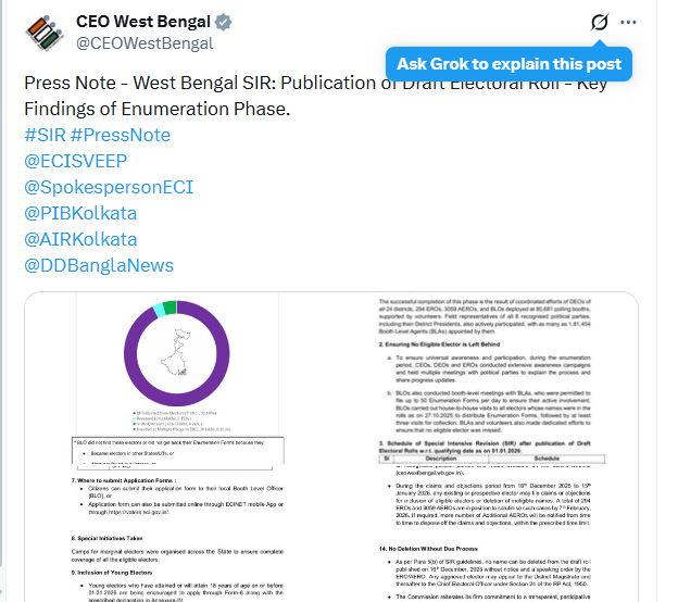 पश्चिम बंगाल ड्राफ्ट वोटर लिस्ट: SIR प्रक्रिया के तहत 58 लाख से अधिक नाम हटाए गए, शहरी सीटों और हिंदी-भाषी मतदाताओं की सूचियों से अधिक कटौती