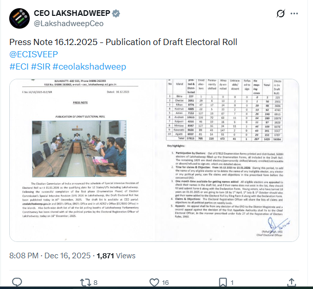 लक्षद्वीप में UT के कुल 57,813 मतदाताओं में से 1,429 मतदाताओं को अस्थायी रूप से हटा दिया गया।