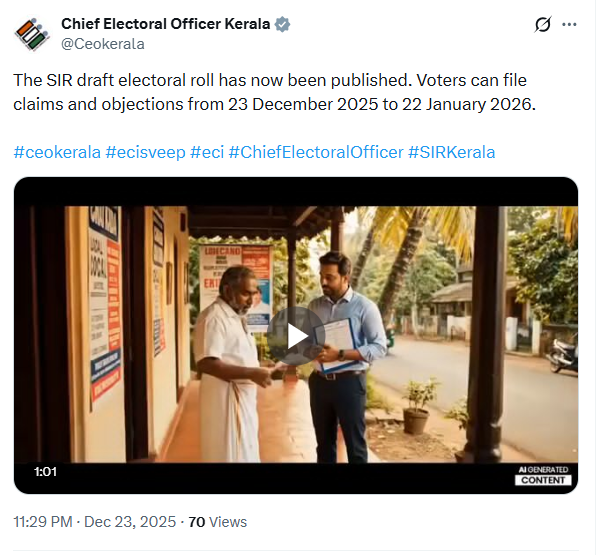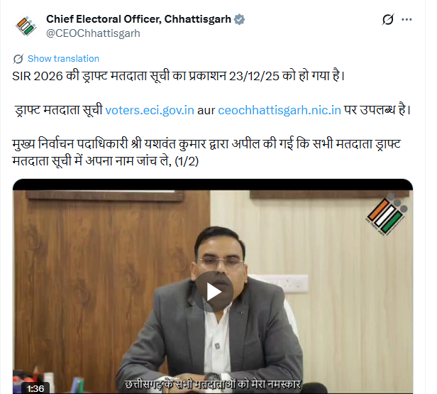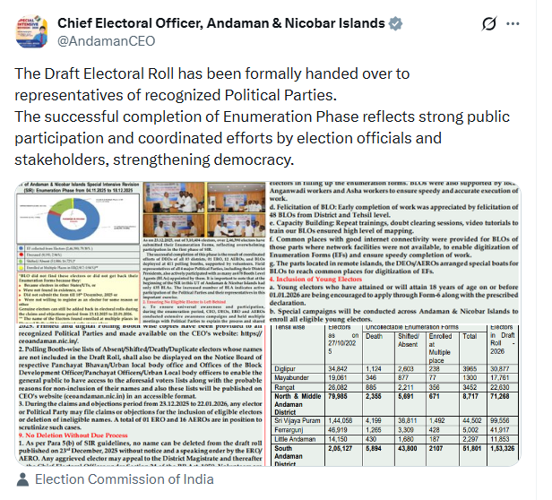 23 दिसंबर को यह एक साथ जारी होना SIR में एक महत्वपूर्ण मोड़ था, जिसमें मध्य प्रदेश, छत्तीसगढ़, केरल और अंडमान और निकोबार द्वीप समूह में ड्राफ्ट वोटर लिस्ट एक साथ सार्वजनिक डोमेन में आईं, जिससे कुल 12 राज्यों और केंद्र शासित प्रदेशों तक यह संख्या बढ़ गई जहां अब ड्राफ्ट लिस्ट प्रकाशित हो चुकी हैं।