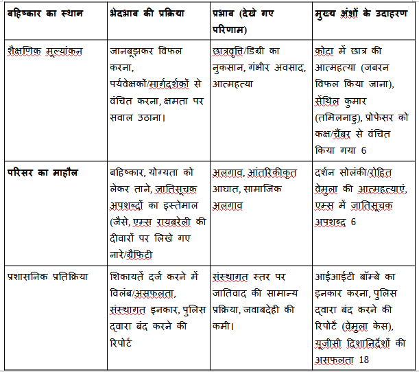 जातिगत भेदभाव भारतीय समाज के उच्चतम स्तरों तक पहुंच गया है, जिससे बहिष्कार की जगह गांव के खेत से बदलकर विश्वविद्यालय के लेक्चर हॉल हो गई है, जिसके परिणामस्वरूप छात्रों की आत्महत्याओं की परेशान करने वाली घटनाएं हुई हैं। एलीट एजुकेशनल संस्थान, मेरिटोक्रेसी वाले सुरक्षित माहौल होने के बजाय, हाशिए पर पड़े स्टूडेंट्स के खिलाफ सिस्टमैटिक, मनोवैज्ञानिक हिंसा के लगातार माहौल में काम करते हैं। यह स्ट्रक्चरल हिंसा मजाक उड़ाने, बहिष्कार, प्रशासनिक भेदभाव और एकेडमिक नुकसान के जरिए की जाती है।