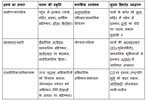 जातिगत हिंसा के विश्लेषण में इसके बढ़ते और अलग-अलग रूपों को पहचानना जरूरी है। हमले अब सिर्फ दूरदराज के ग्रामीण इलाकों तक ही सीमित नहीं हैं, बल्कि ये जगह और संस्थानों की ऊंची सीढ़ी पर पहुंच गए हैं, स्थानीय रीति-रिवाजों पर नियंत्रण से लेकर शहरी संस्थानों में जटिल मनोवैज्ञानिक नियंत्रण तक और आखिरकार देश के सर्वोच्च संवैधानिक पदों के साथ खुले राजनीतिक और वैचारिक टकराव तक पहुंच गए हैं।