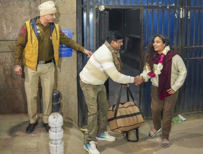 फोटो क्रेडिट: PTI और सोशल मीडिया: 7 जनवरी की देर रात रिहाई के बाद गुलफिशा फातिमा तिहाड़ जेल के ठीक बाहर अपने परिवार वालों से मिलीं।