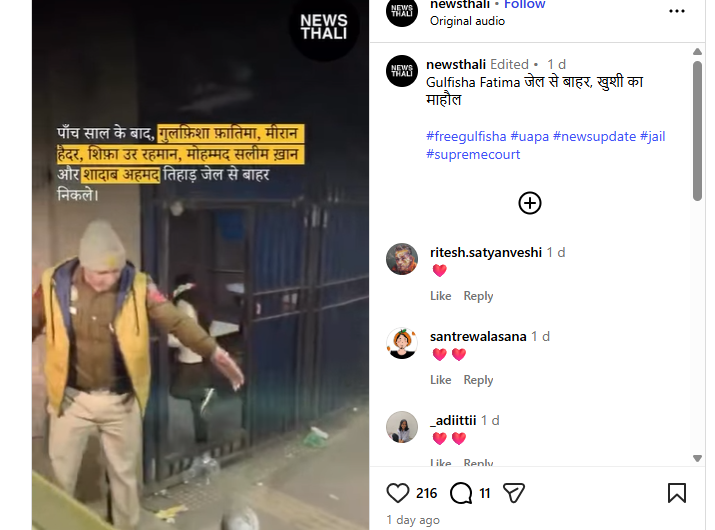 गुलफिशा फातिमा, मीरान हैदर, मोहम्मद सलीम खान और शिफा उर रहमान की तस्वीरें और वीडियो—जिनमें वे आंसुओं और गले मिलने के बीच दोस्तों और परिवार से मिलते दिख रहे हैं—खूब साझा किए गए। इस रिहाई के साथ #आजादी का टैग भी जुड़ा रहा।