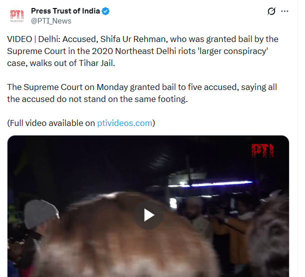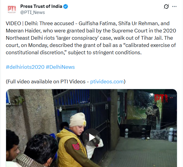 नई दिल्ली: चार एक्टिविस्ट, जिन्हें 2020 में दिल्ली पुलिस द्वारा दर्ज की गई कई FIR (फरवरी दंगों की कथित “साजिश” मामले) के बाद कड़े गैरकानूनी गतिविधियां (रोकथाम) अधिनियम, 1967 के तहत जेल में डाला गया था, सोमवार, 5 जनवरी को सुप्रीम कोर्ट के आदेश के बाद रिहा कर दिए गए। जेल से बाहर आते ही उनका स्वागत खुशी, फूलों और स्वागत गीतों के साथ किया गया। सोशल मीडिया पर उनकी रिहाई के वीडियो और तस्वीरें तेजी से वायरल हो गईं।