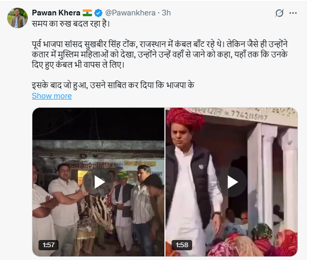 इसी बीच, कांग्रेस के मीडिया प्रभारी पवन खेड़ा ने एक्स पर दो वीडियो साझा करते हुए लिखा, “समय का रुख बदल रहा है। पूर्व भाजपा सांसद सुखबीर सिंह टोंक, राजस्थान में कंबल बांट रहे थे। लेकिन जैसे ही उन्होंने कतार में मुस्लिम महिलाओं को देखा, उन्होंने उन्हें वहां से जाने को कहा, यहां तक कि दिए हुए कंबल भी वापस ले लिए। इसके बाद जो हुआ, उसने साबित कर दिया कि भाजपा के दिन अब गिने-चुने रह गए हैं। इलाके के हिंदू एकजुट होकर सुखबीर सिंह को इंसानियत का सबक सिखाने के लिए आगे आए। उन्होंने उनकी विभाजनकारी सांप्रदायिक राजनीति को नकार दिया और सामूहिक रूप से उनके बांटे गए कंबल और मिठाइयां लौटाने का निर्णय लिया। ऐसा करके उन्होंने हिंदू-मुस्लिम एकता का उदाहरण पेश किया है — वही एकता जिससे भाजपा सबसे अधिक डरती है। टोंक के लोगों के पास खोने के लिए कुछ नहीं है; उनके लिए कंबलों या मिठाइयों की कोई कमी नहीं होगी। असली हार सुखबीर सिंह की हुई है, क्योंकि राजस्थान की जनता की एकता और नैतिक स्पष्टता ने उन्हें बेनकाब कर दिया है। विडंबना यह है कि यही भाजपा ‘भगवान’ का नाम सबसे अधिक लेती है, लेकिन करुणा, गरिमा और निःस्वार्थ सेवा जैसे मूल्यों को निभाने में असफल रहती है।”