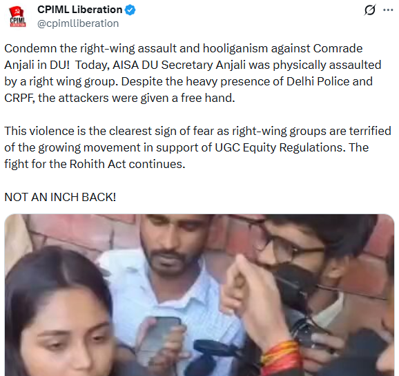 दिल्ली यूनिवर्सिटी में अंबेडकरवादी और लेफ्ट समूह लगातार प्रदर्शन कर रहे हैं, जिसमें UGC गाइडलाइंस 2026 को लागू करने की मांग की जा रही है, जिन पर सुप्रीम कोर्ट ने रोक लगा दी थी। ऐसे ही एक मामले में, UGC इक्विटी रेगुलेशंस को लेकर एक लामबंदी के दौरान हुए टकराव में AISA की महिला नेताओं को कथित तौर पर यौन धमकियां दी गईं, जबकि एक दक्षिणपंथी यूट्यूबर ने मारपीट की अलग शिकायत दर्ज कराई। पुलिस ने समानांतर एफआईआर दर्ज की हैं।