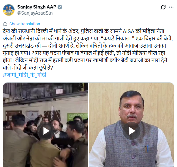 AAP सांसद संजय सिंह ने सोशल मीडिया पर एक वीडियो साझा करते हुए आरोप लगाया कि पुलिस की मौजूदगी में AISA की महिला नेताओं और उनकी मां के साथ अपमानजनक व्यवहार किया गया और उनसे “कपड़े उतारने” को कहा गया।