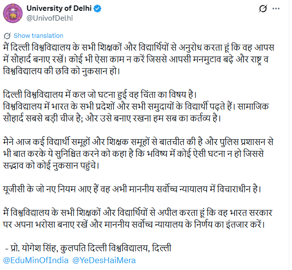 दिल्ली यूनिवर्सिटी स्टूडेंट्स यूनियन (DUSU) के अध्यक्ष आर्यन मान ने निष्पक्ष जांच की मांग की। वाइस-चांसलर योगेश सिंह ने घटना को चिंताजनक बताया और सामाजिक सद्भाव बनाए रखने की अपील की।