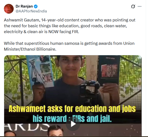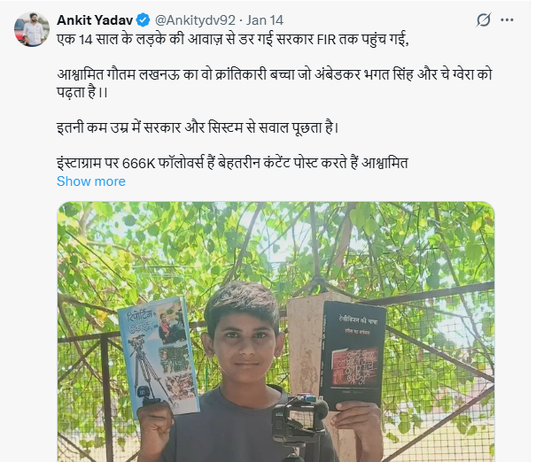 एक अन्य पोस्ट में कहा गया, “14 साल के बच्चे के खिलाफ FIR करना कानून लागू करना नहीं है। यह डर है। लखनऊ के 14 साल के कंटेंट क्रिएटर अश्वमित गौतम के खिलाफ योगी सरकार द्वारा FIR दर्ज करना बेहद परेशान करने वाला और शर्मनाक है। यह न्याय के बारे में नहीं है; यह एक ऐसी सरकार के बारे में है जो सवाल बर्दाश्त नहीं कर सकती।