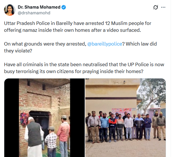 इस कार्रवाई पर कांग्रेस नेता डॉ. शमा मोहम्मद ने सवाल उठाए हैं। उन्होंने कहा, “बरेली में उत्तर प्रदेश पुलिस ने एक वीडियो सामने आने के बाद अपने ही घरों में नमाज़ पढ़ने के आरोप में 12 मुस्लिम नागरिकों को हिरासत में लिया है। @bareillypolice यह बताएं कि उन्हें किस आधार पर पकड़ा गया और उन्होंने किस कानून का उल्लंघन किया? क्या राज्य के सभी अपराध समाप्त हो चुके हैं कि यूपी पुलिस अब अपने ही नागरिकों को उनके घरों में प्रार्थना करने से डराने में लगी है?”