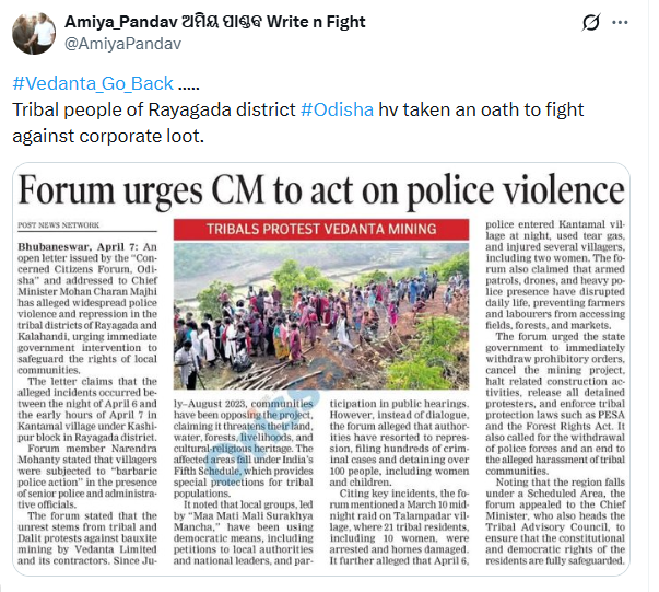 “कंसर्न्ड सिटिज़न्स फोरम” के एक खुले पत्र में पुलिस की कार्रवाई को “बर्बर” बताया गया है और सेना को वापस बुलाने, हिरासत में लिए गए लोगों को रिहा करने और खनन परियोजना को रद्द करने की मांग की गई है।
