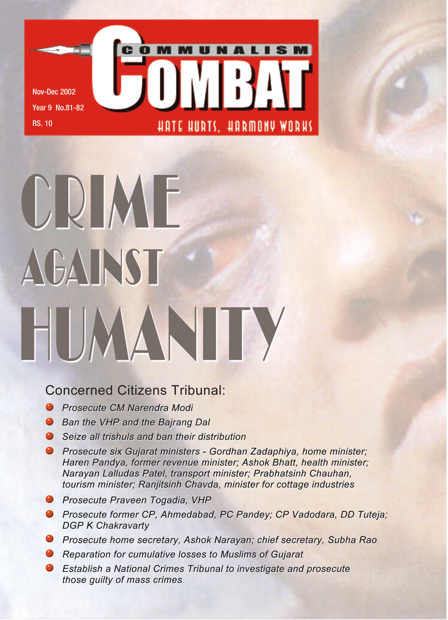 On November 21, 2002, an eight–member Concerned Citizens Tribunal, consisting of retired supreme court and high court judges, activists and academics, released a report based on a detailed investigation into the gruesome carnage in Gujarat, earlier this year. The report, ‘Crime Against Humanity’, is a severe indictment of the Gujarat government, senior IAS and IPS officials as also the central government. Tribunal members have released their report from Ahmedabad, New Delhi, Mumbai and Hyderabad.